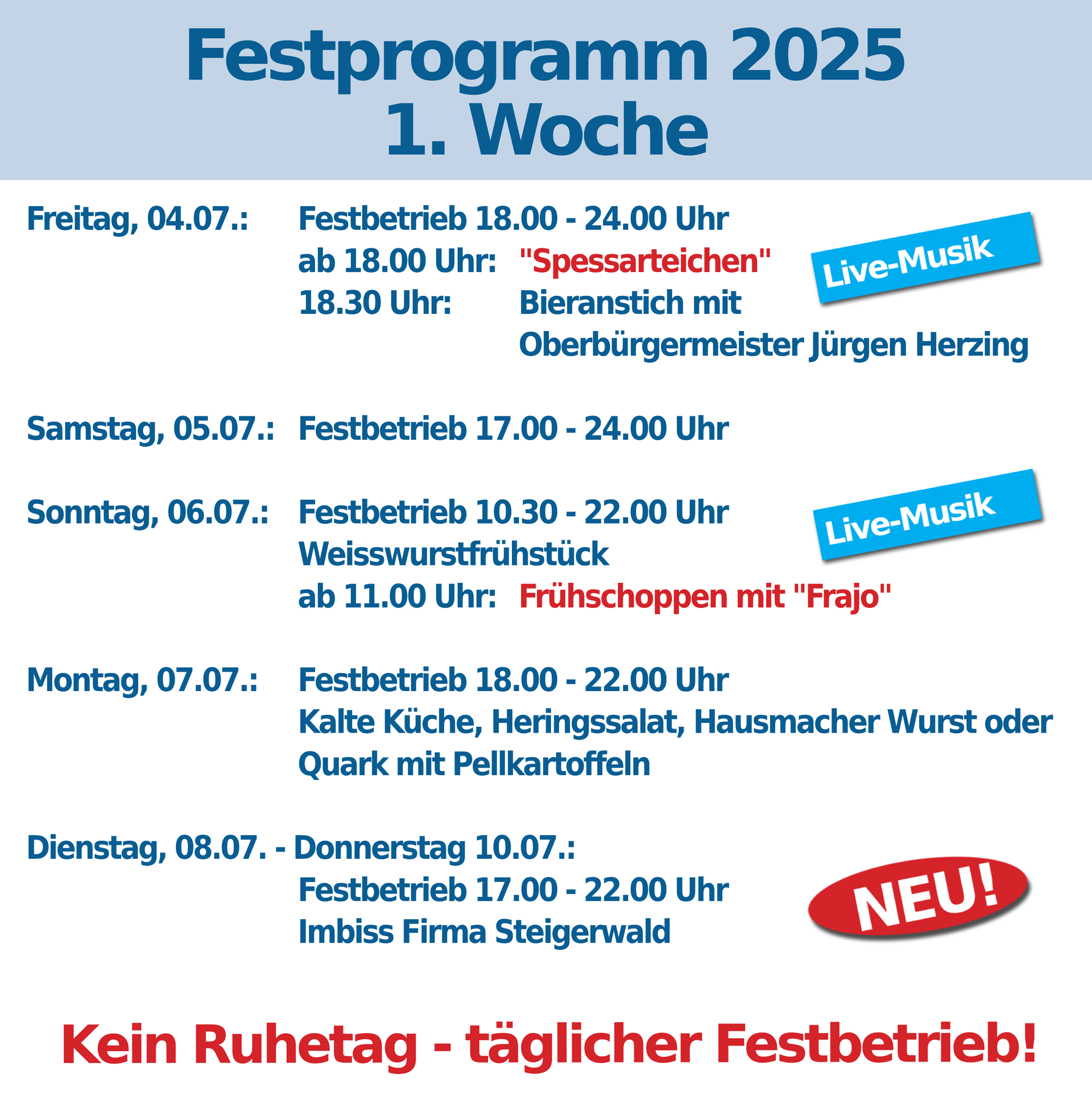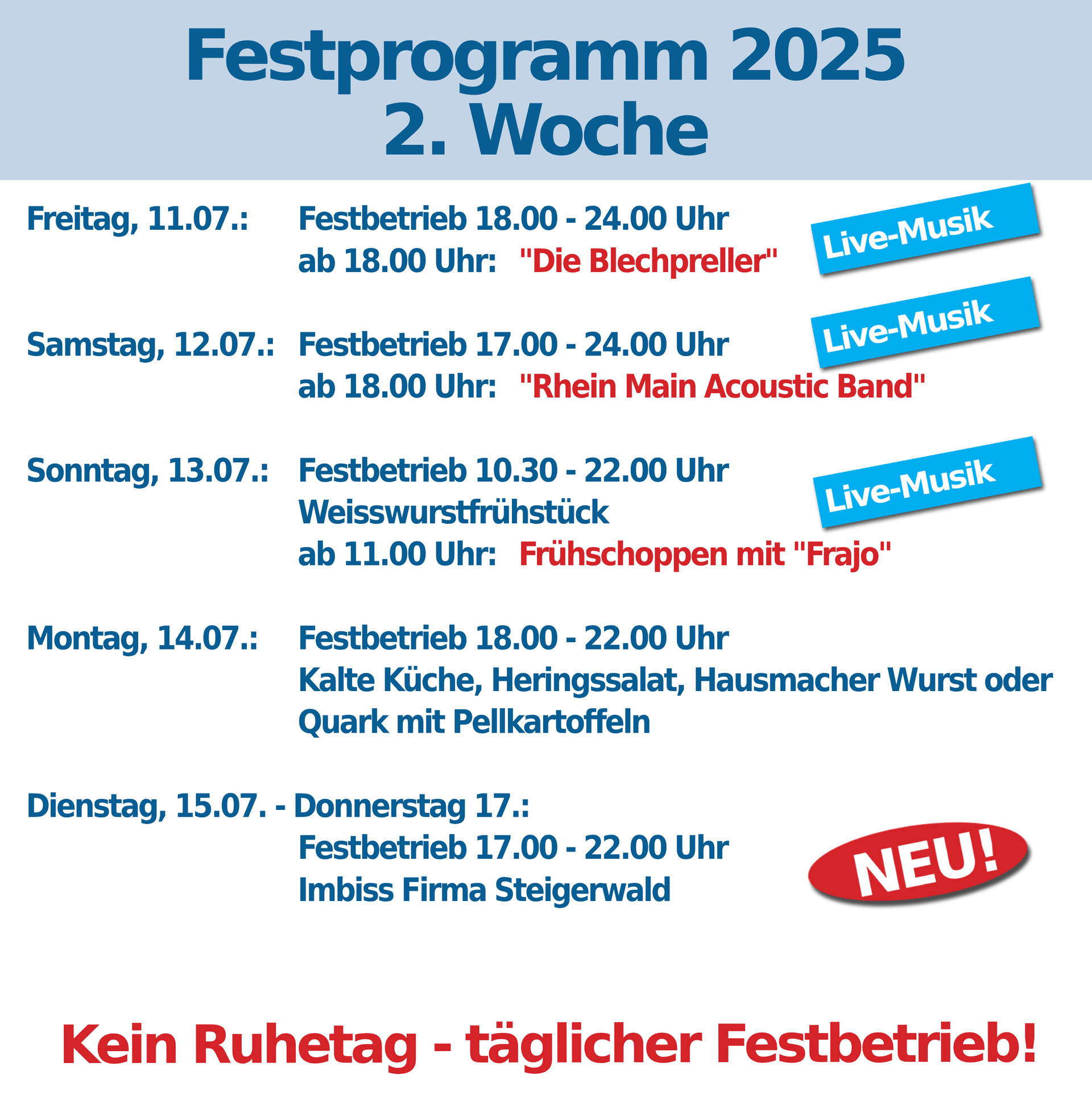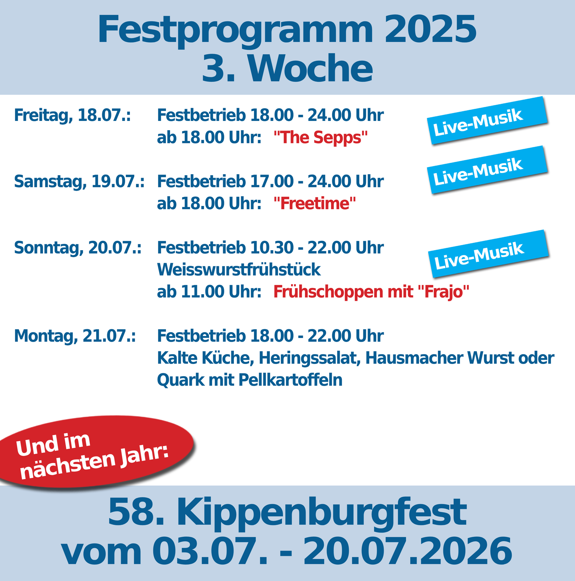 In diesem Jahr haben wir auch von Dienstag bis Donnerstag mit Getränken und einer kleinen Auswahl an Speisen für Sie geöffnet. Nutzen Sie die Gelegenheit, auch unter der Woche die besondere Atmosphäre des Kippenburgfests zu erleben.